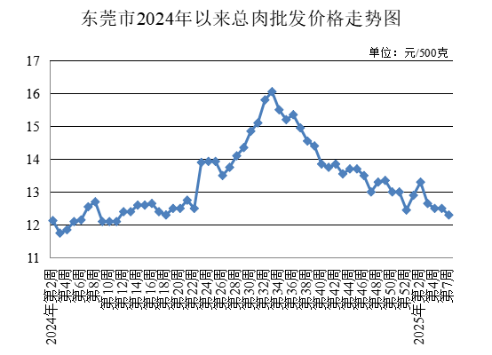 第7周,監測的生豬出場價格為每公斤15.40元,較上周下降9.41%。總肉批發均價為每500克12.30元,較上周下降1.60%。
