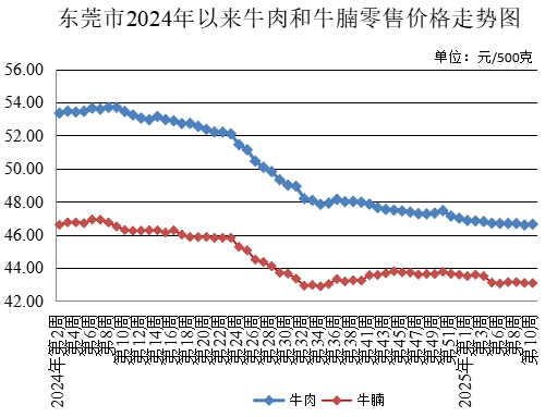 第10周,所監測的牛肉農貿市場零售均價為每500克46.64元,較上周上升0.11%。牛腩農貿市場零售均價為每500克43.08元,較上周下降0.02%。雞肉農貿市場零售均價為每500克16.64元,較上周下降0.54%。
